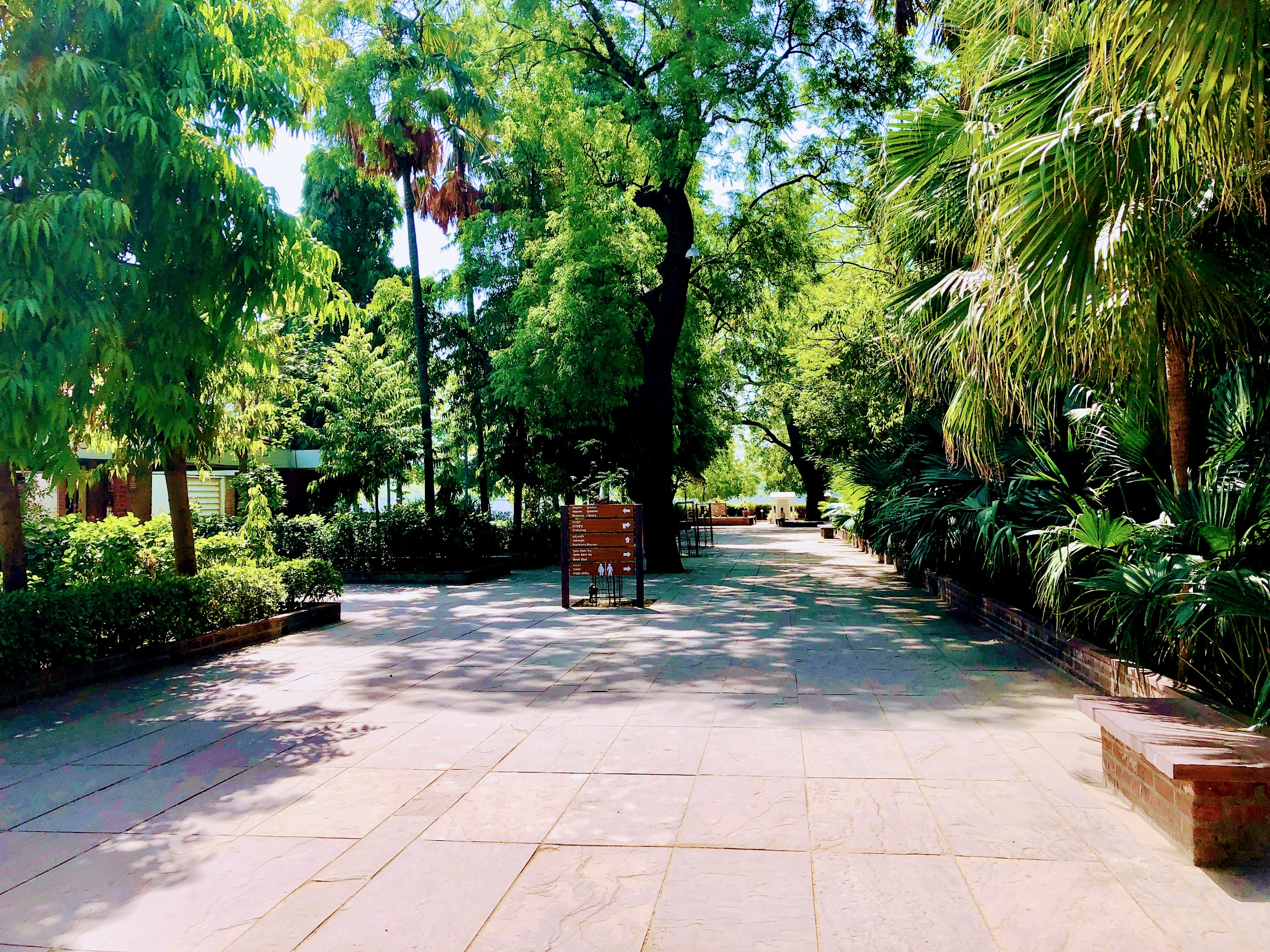 Immersed in lush greenery, a tranquil path unfolds, leading to the majestic Sun Temple.