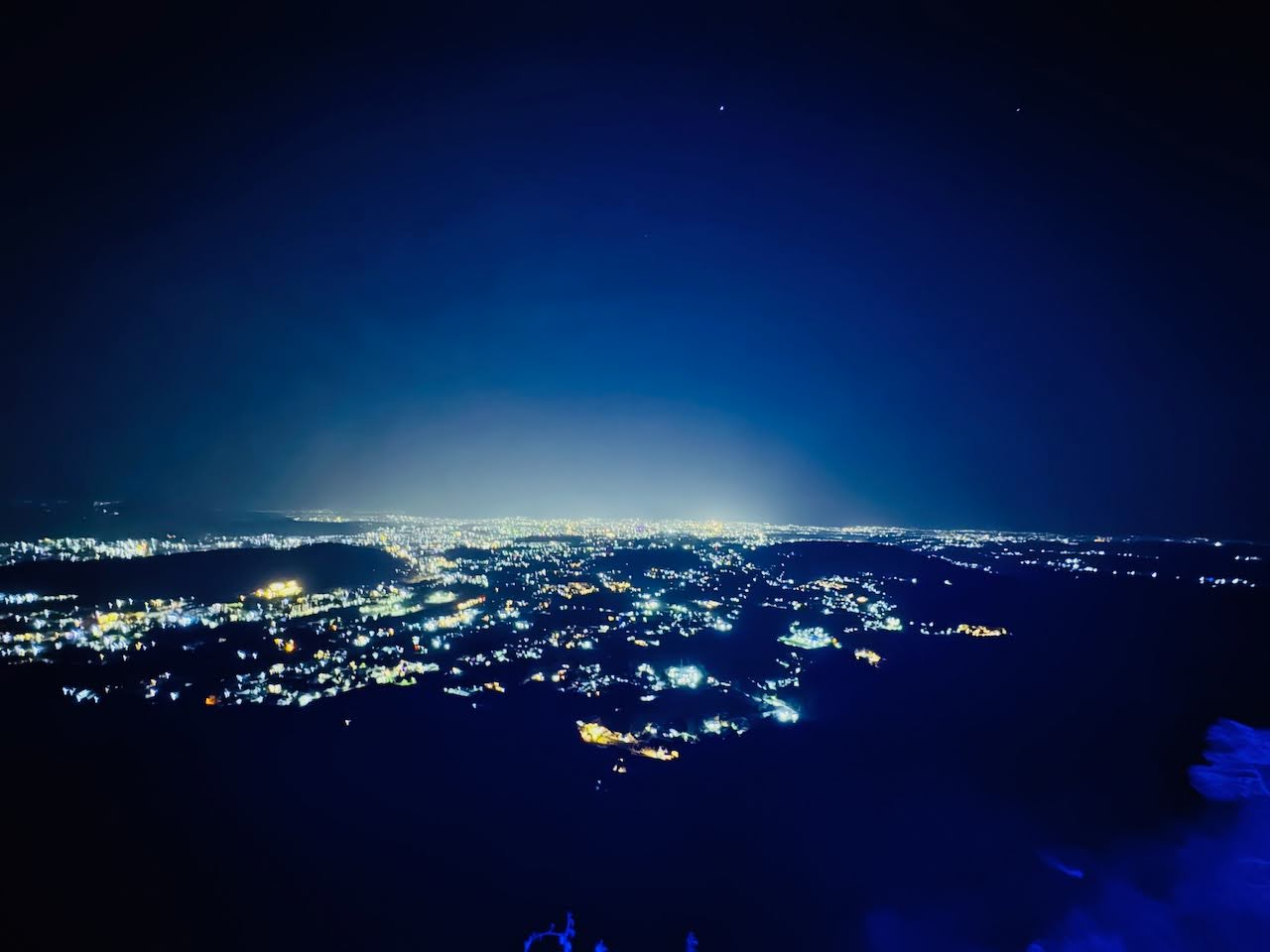 Dehradun’s sparkling city lights as seen from the serene hills of Mussoorie at night.