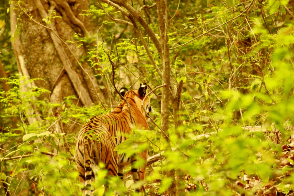 Jim Corbett did not disappoint. Unfazed by the 15-20 jeeps trailing behind, he walked off majestically.