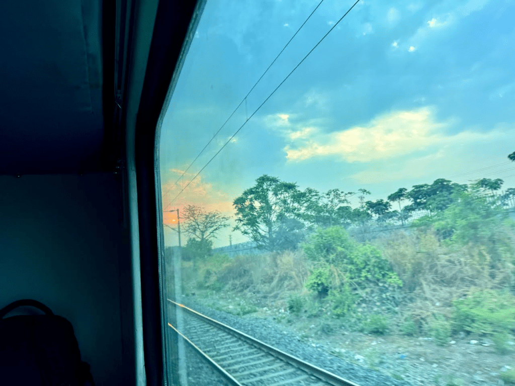 We reached the back gate of the railway station and made our way to platform 8. We had booked Second AC tickets, and to our surprise, the compartment was full. My daughter and I shared a bed (though she had her own), and the food served on the train was really good. As we woke up, the sight outside the train window was a treat. The sun was rising, casting beautiful orange hues across the landscape. We sipped on hot tea and nibbled on biscuits, savoring the serene morning.