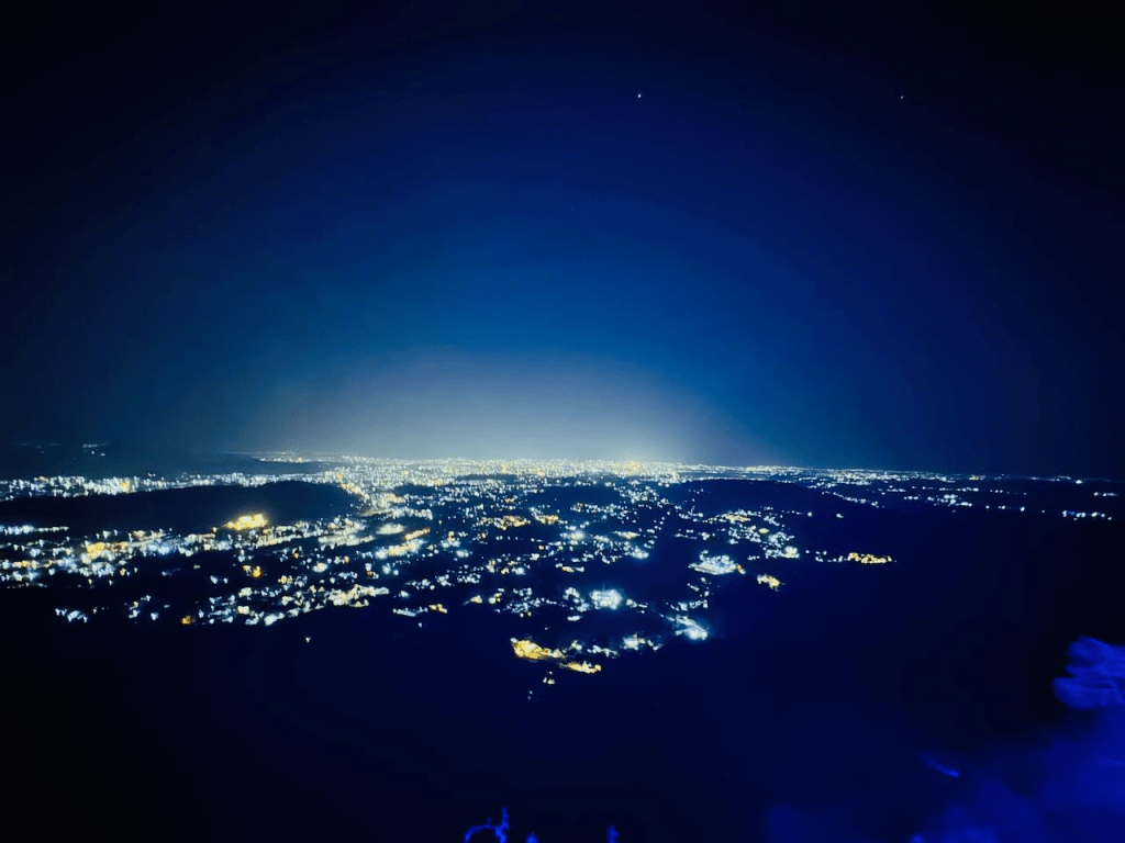 We decided to take a break midway to soak in the atmosphere. The air was cool, windy, and chilly, providing a refreshing change from the city’s heat. From our vantage point, the entire town of Dehradun below us was buzzing with artificial lights, creating a mesmerising view. It was a perfect moment to pause and appreciate the serene beauty surrounding us before continuing our journey.