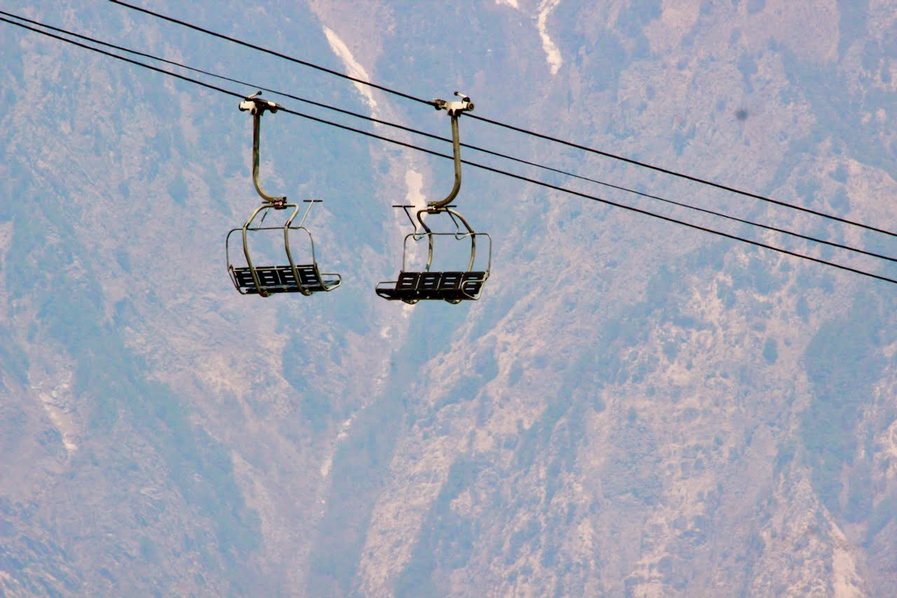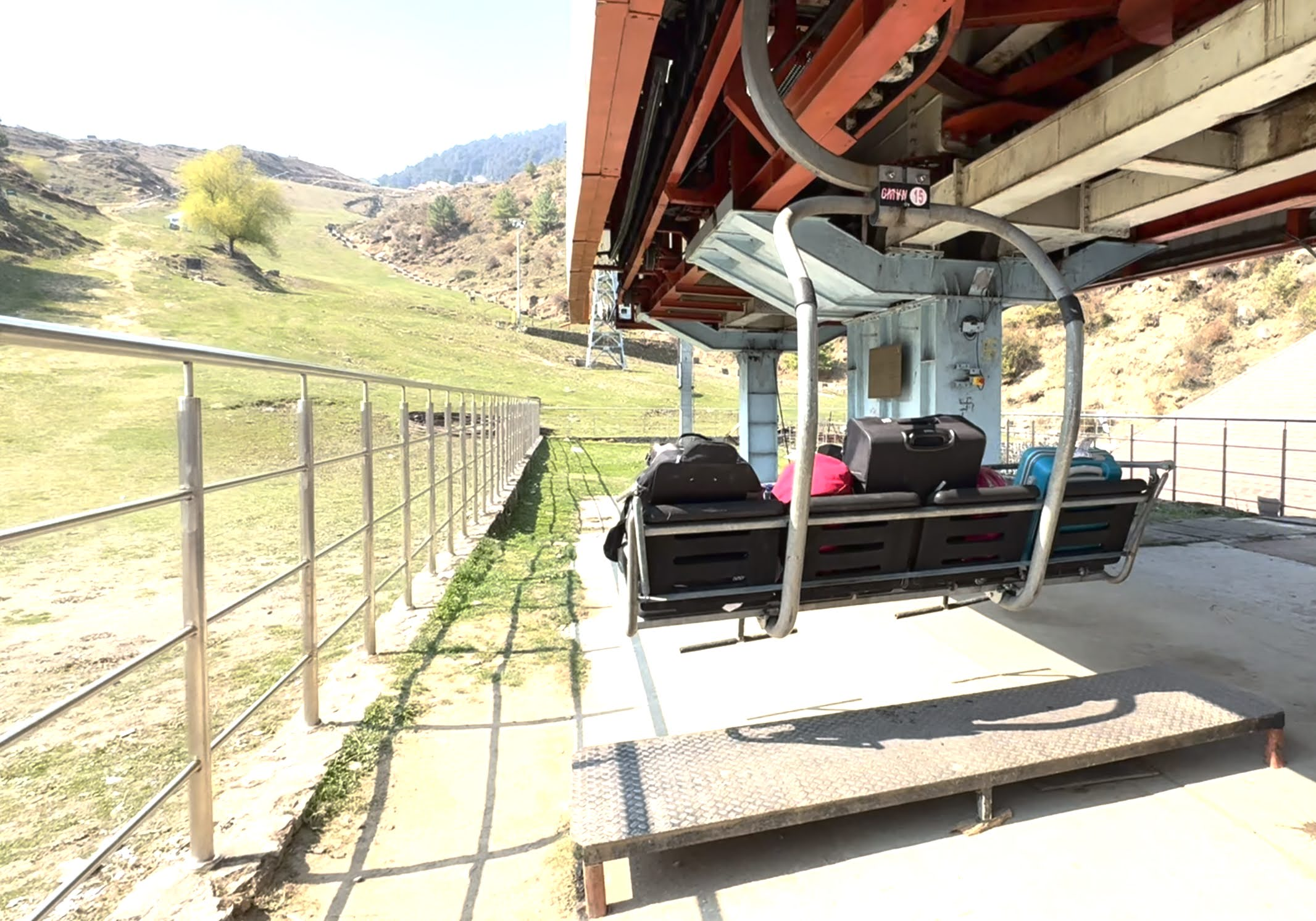 Luggages dangle precariously in the chair car; a nerve-wracking sight amidst the stunning mountain backdrop.