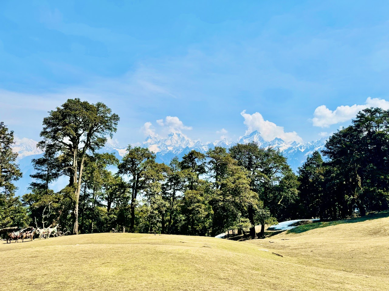 The majestic Nanda Devi Peaks towering in the background, adding grandeur to the serene landscape.