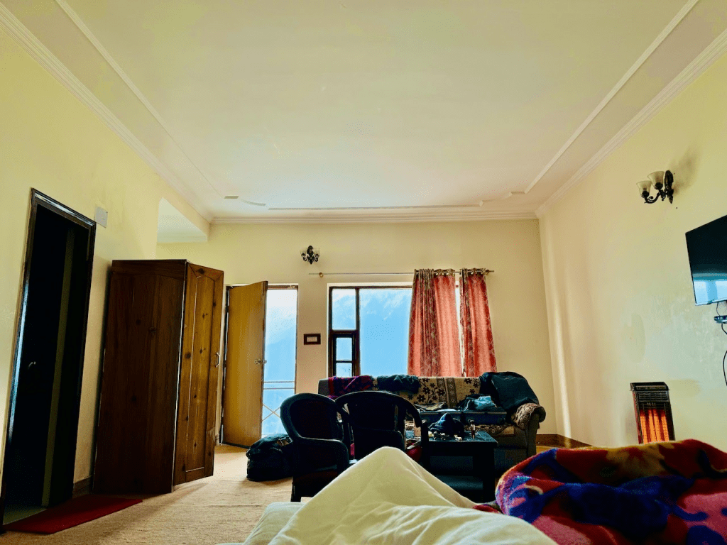 Upon entering our room, we were greeted by an expansive space—a luxurious 1 BHK suite with three balconies offering a 270-degree panoramic view of the surrounding snow-capped mountains, including the majestic Nanda Devi. For a moment, we were awestruck by the beauty around us, but reality struck soon after. The power went out, taking the heater with it, and the chill began to creep in. We asked about the outage and were informed that power cuts were routine, lasting from 8 AM to 6 PM daily—a startling inconvenience at a premium resort.
