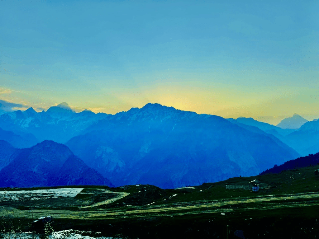 A mesmerizing farewell to end our stay at Auli. The Golden hues of the setting sun cast a warm glow over the snow-covered peaks.